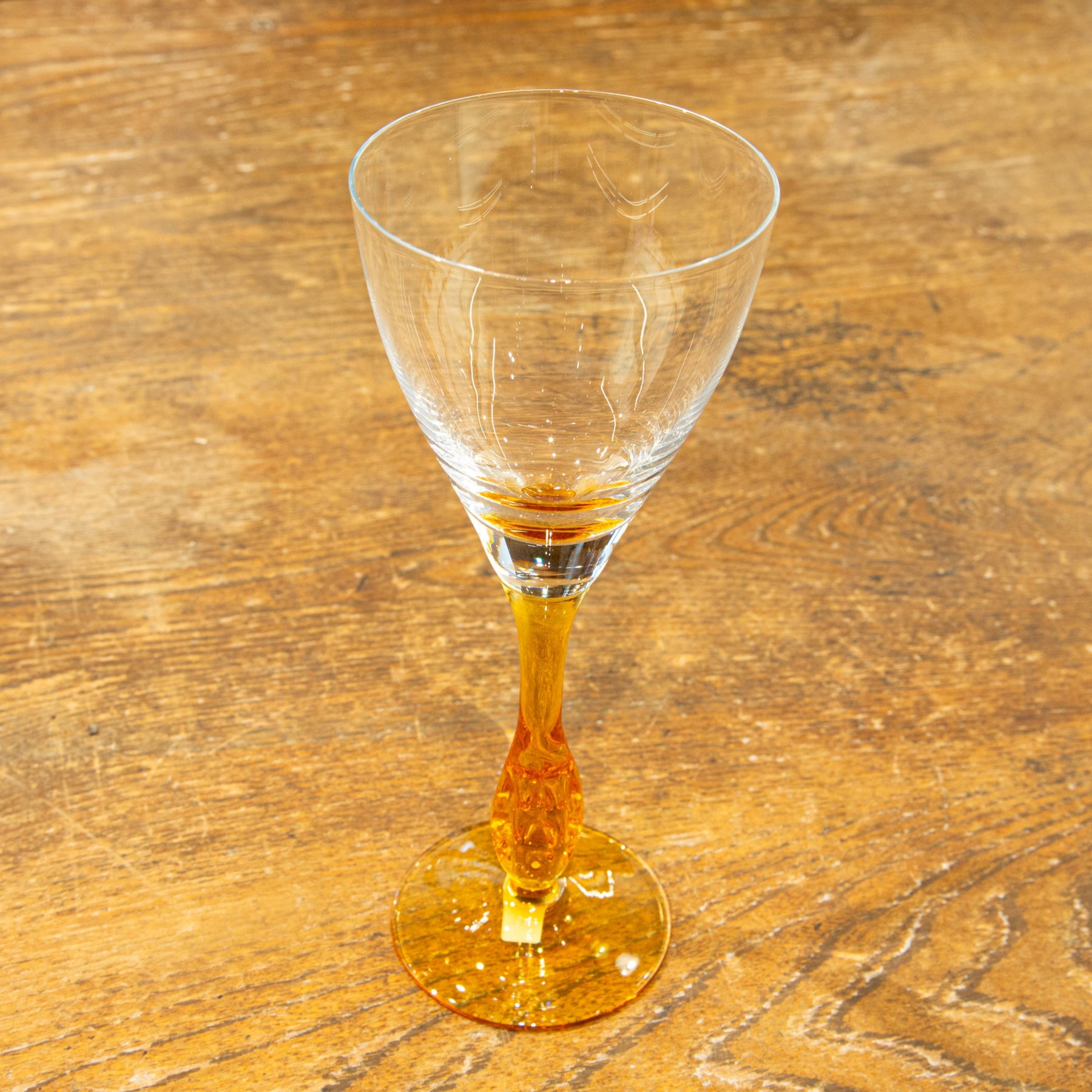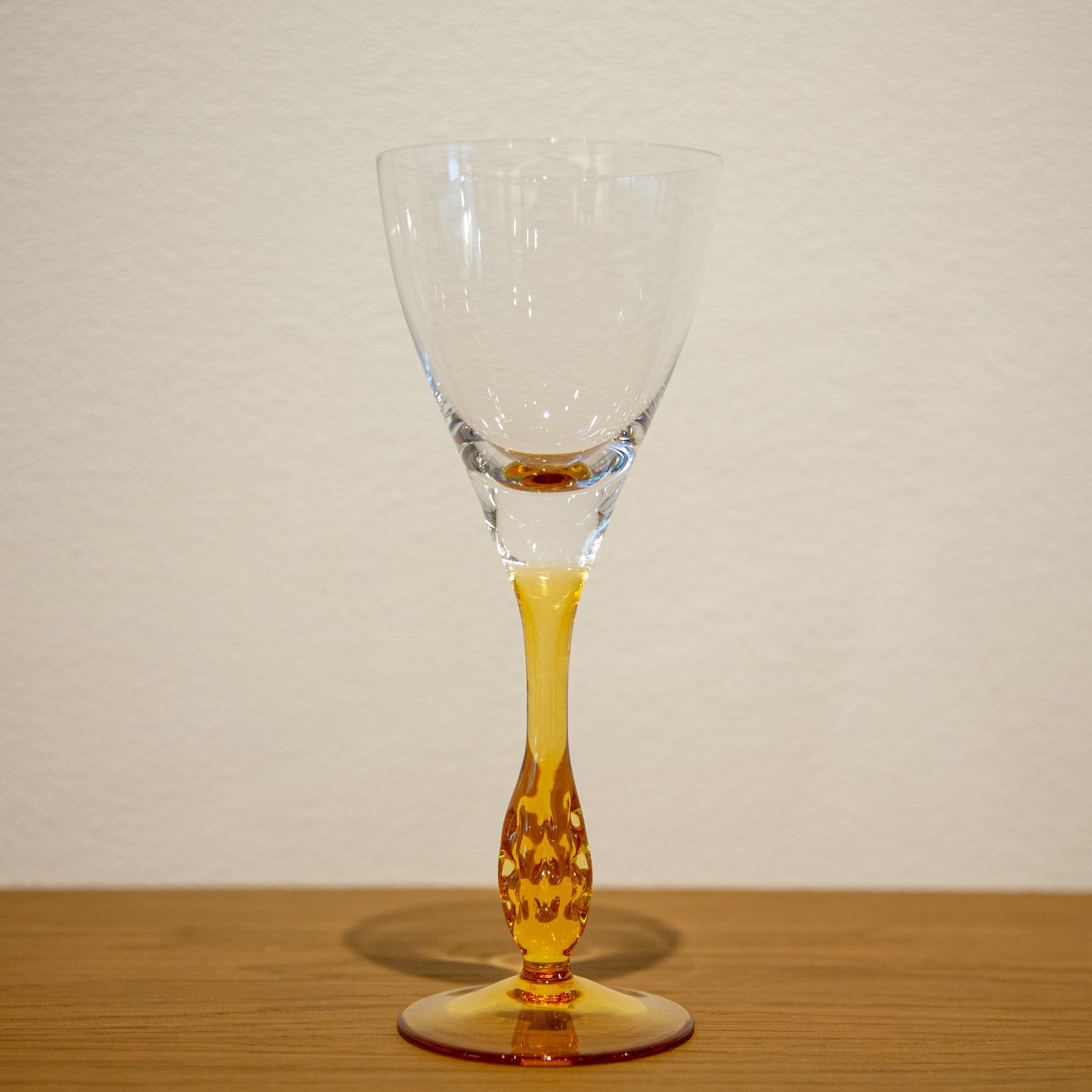 グラデーションの色合いと黄色い持ち手が特徴的な レトロワイングラス。 個性的で遊び心のあるデザインが、テーブルを明るく彩ります。 レトロ感とユニークさを兼ね備えた一品です。