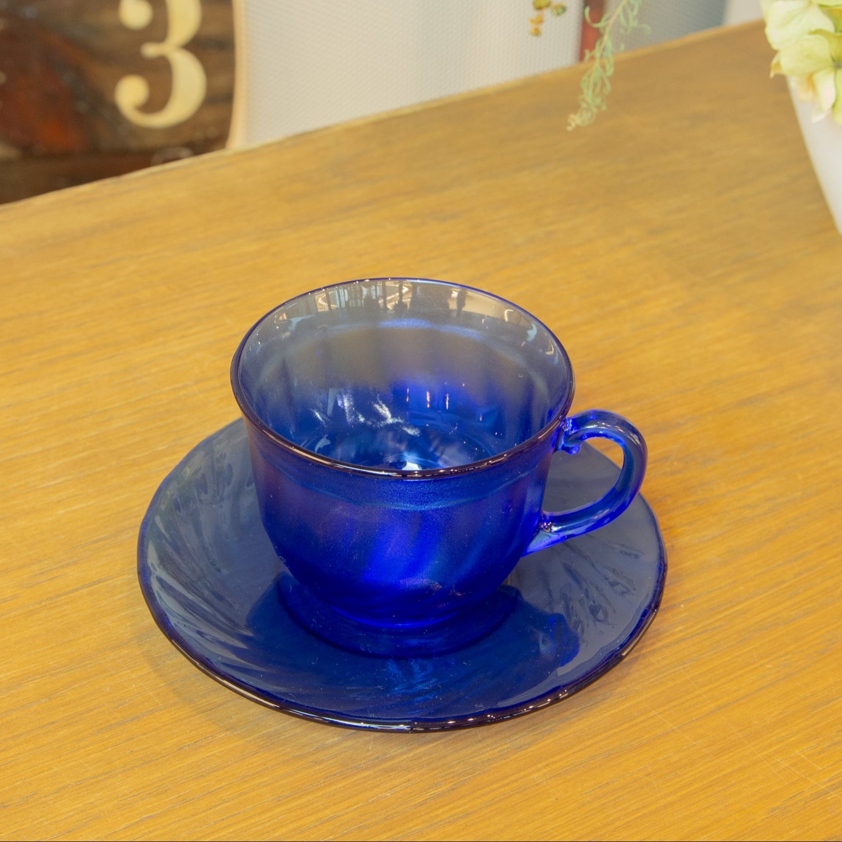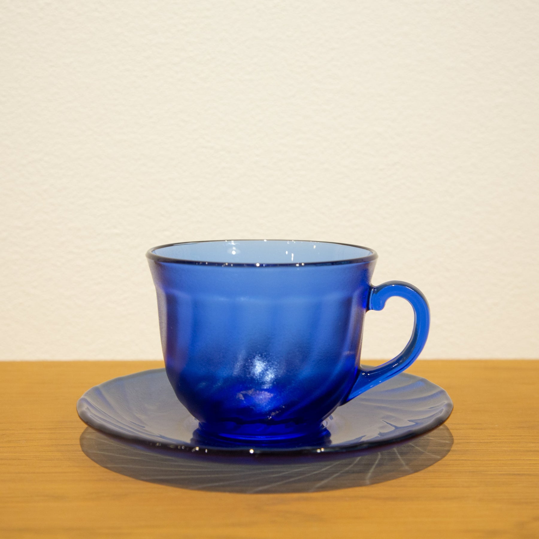 フランス製の レトロガラスカップ&ソーサー。 深みのある青色のガラスが特徴で、強い存在感を放ちます。 光を受けると鮮やかに輝き、インテリアとしても魅力的な一品です。